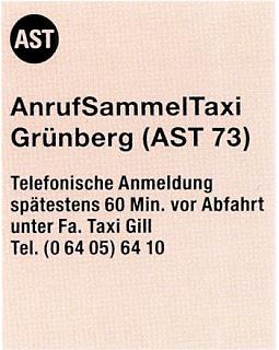 | Das AST fährt nach einem festgelegten Fahrplan. Um eine Fahrt zu buchen, genügt ein Anruf unter der Nummer 06405/6410 Fahrten vor 8 Uhr sollten am Vortag bestellt werden. Bei allen anderen Fahrten genügt die telefonische Anmeldung eine Stunde vor der Abfahrt. |